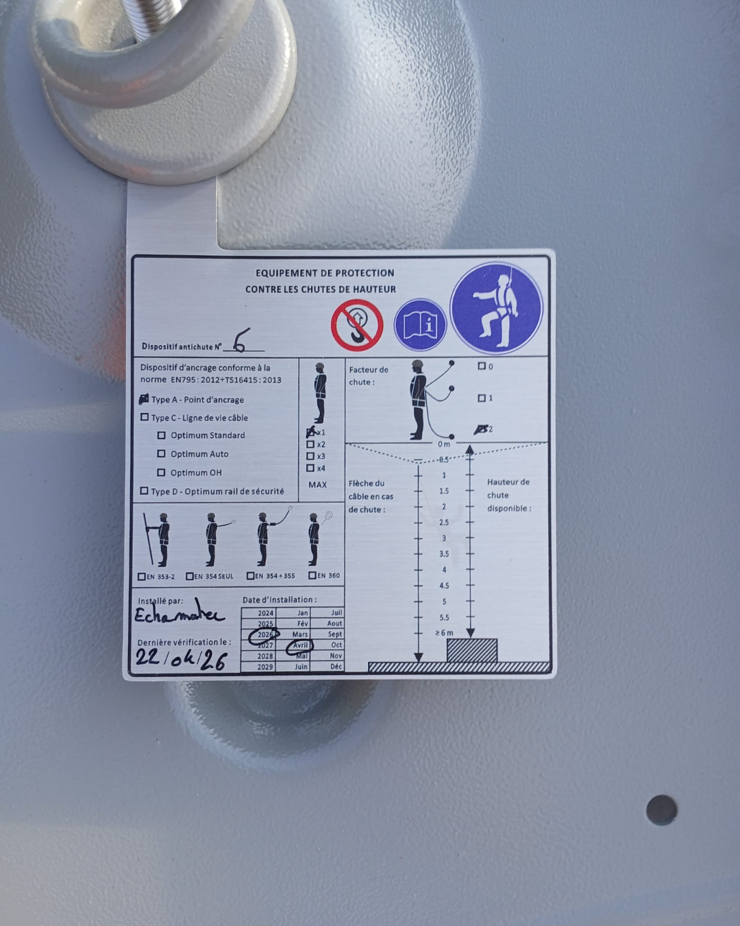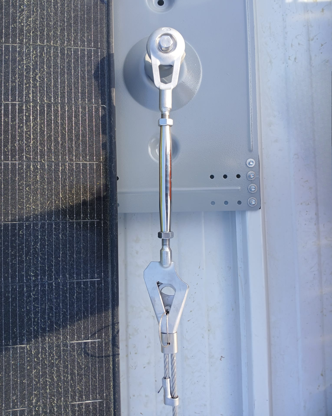 Auf dem Stahlblechdach eines Sportzentrums in Meyrin wird eine Absturzsicherung installiert. Diese Ausrüstung ermöglicht eine sichere Reinigung und Wartung der Solarpaneele.